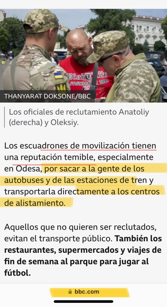 «Los funcionarios de reclutamiento están a la caza de aquellos que evitan registrarse, lo que ha empujado a que más hombres que no quieren alistarse se escondan», decía ta ya la BBC Mundo en una nota de Jean Mackenzie desde Odesa, Ucrania, el 18 de junio de 2024. ¿Pero en redes sociales nos acusaban de mentir? y, ¿hasta Youtube personalmente me ha censurado videos?. Realmente muy penoso todo ya que en toda guerra o conflicto armado, los soldados cumplen su deber. Muy distinto es cuando hablamos de grupos terroristas, donde obviamente «tomo partido». Aún recuerdo mis manos lastimadas de tanto sacar escombros por el atentado bestial a la sede de la AMIA en Buenos Aires (Calle Pasteur 633, Julio de 1994).
