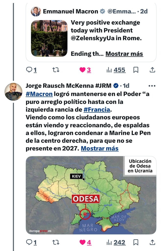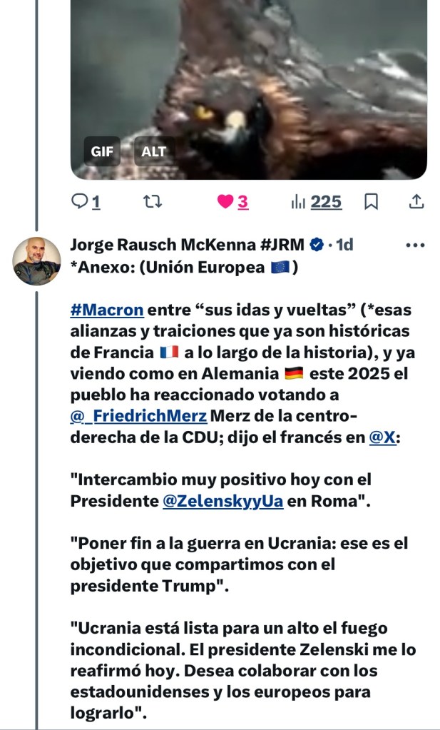 Macron entre “sus idas y vueltas” (*esas alianzas y traiciones que ya son históricas de Francia a lo largo de la historia), y ya viendo como en Alemania 🇩🇪 este 2025 el pueblo ha reaccionado votando a Friedrich Merz de la centro-derecha de la CDU, dijo el francés en @X:
