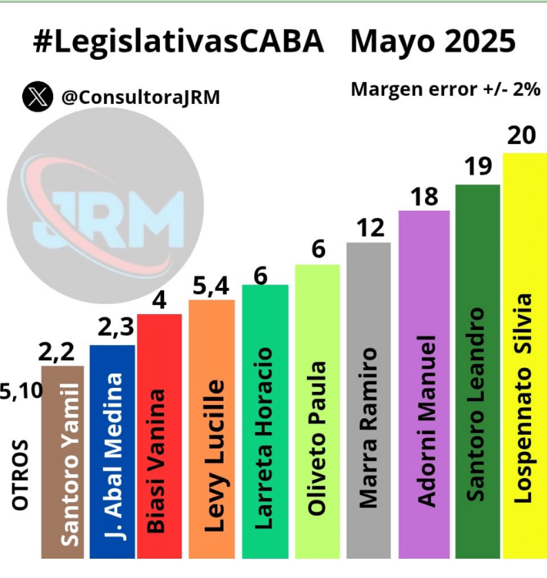 Según publicó en X el portal digital Noticias 24 Argentina en la fecha, publicaron la «primera medición pública de las elecciones a legisladores porteñas 2025. Proyecciones según la @ConsultoraJRM & Asociados, dan a Silvia Lospennato arriba de Leandro Santoro en un escenario de tres tercios».