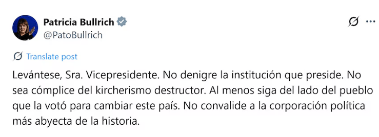 “Levántese, Sra. Vicepresidente. No denigre la institución que preside. No sea cómplice del kircherismo destructor. Al menos siga del lado del pueblo que la votó para cambiar este país. No convalide a la corporación política más abyecta de la historia.”, le recriminó la funcionaria nacional y agregó y agregó: “No se puede permitir, están planteando un golpe institucional y llevarse puesto al Senado. Las instituciones, las normas y la República se respetan”.