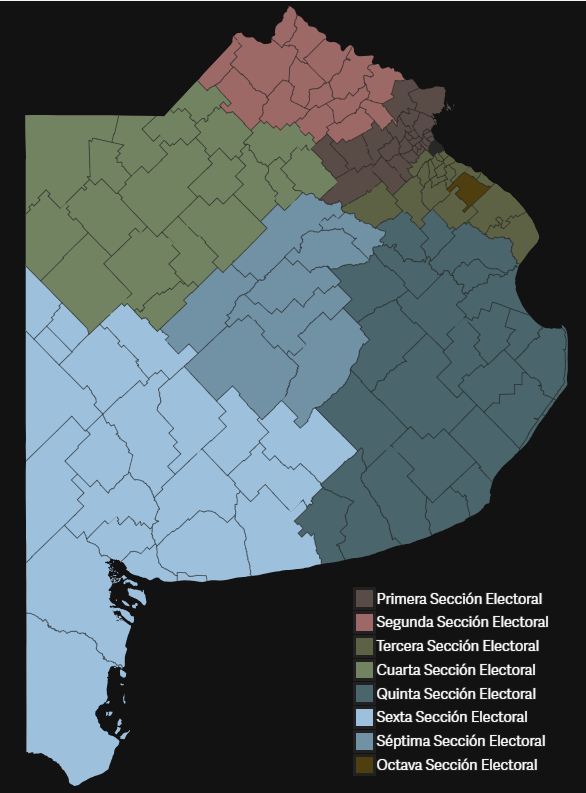 La quinta sección se compone de 27 partidos, con más de 1.200.000 electores, y allí se eligen cinco senadores: