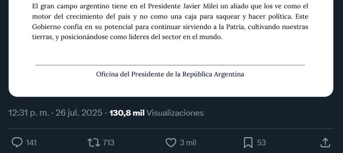 El gran campo argentino tiene en el Presidente Javier Milei un aliado que los ve como el motor del crecimiento del país y no como una caja para saquear y hacer política. Este Gobierno confía en su potencial para continuar sirviendo a la Patria, cultivando nuestras tierras, y posicionándose como líderes del sector en el mundo.