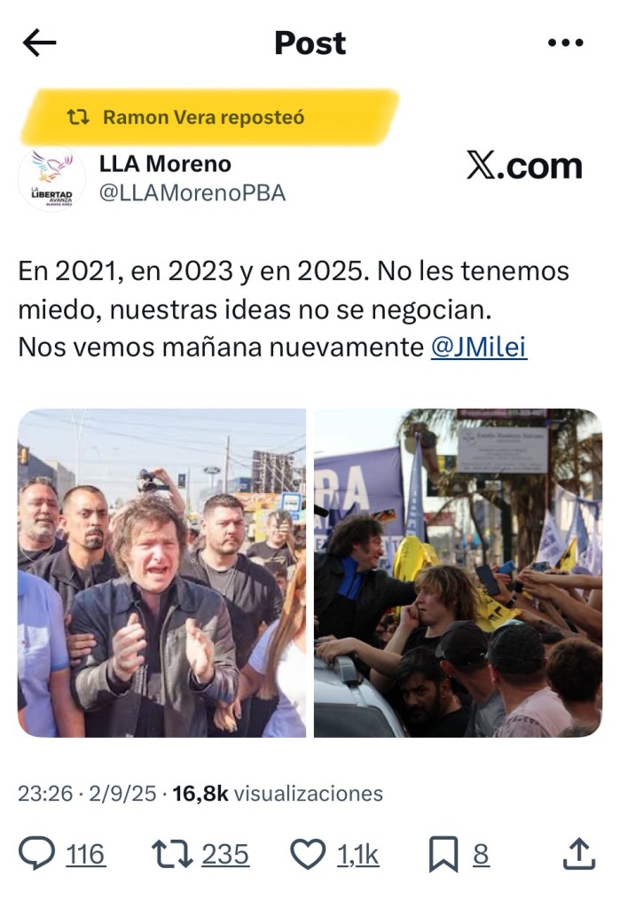 «El club, situado en una zona humilde de Moreno, se llenó de vecinos, pero también de visitantes de otras localidades que llegaron al lugar a pesar de las tensiones previas por posibles incidentes con militantes de otras agrupaciones», dice INFOBAE, aunque en varias imágenes fue muy notable la ausencia de simpatizantes genuinos del partido Libertario.