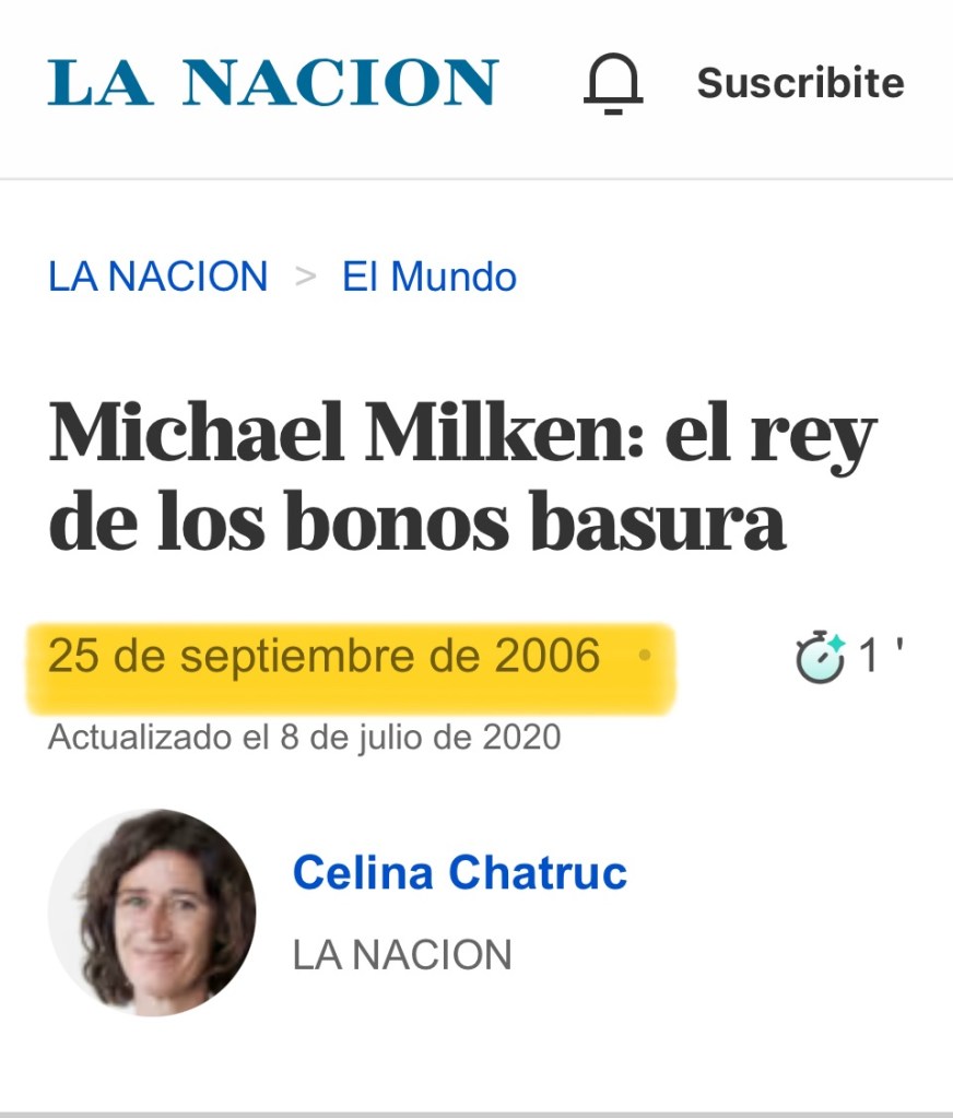 Finalmente desde La Nación se lee: “Esta es la última columna de la serie Ayer y hoy” – Por Celina Chatruc – Anexo el link del diario aludido al inicio del artículo: https://www.lanacion.com.ar/el-mundo/michael-milken-el-rey-de-los-bonos-basura-nid843453/