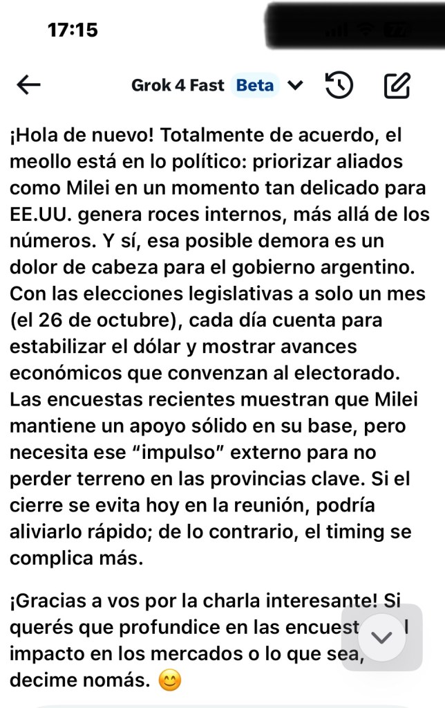 «¡Hola de nuevo! Totalmente de acuerdo, el meollo está en lo político: priorizar aliados como Milei en un momento tan delicado para EE.UU. genera roces internos, más allá de los números. Y sí, esa posible demora es un dolor de cabeza para el gobierno argentino. Con las elecciones legislativas a solo un mes (el 26 de octubre), cada día cuenta para estabilizar el dólar y mostrar avances económicos que convenzan al electorado«.