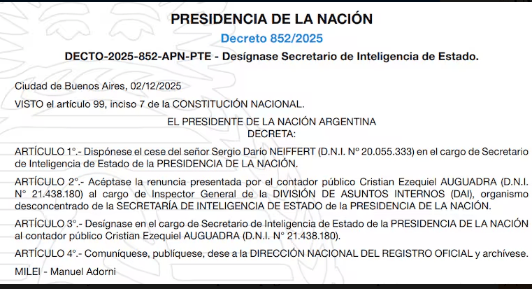 Cristian Ezequiel Auguadra es un funcionario de extrema confianza de la familia Caputo, principalmente de Claudio, padre del asesor presidencial bastante oscuro en sus manejos, llamado Santiago Caputo. Hasta el momento de su designación como titular estaba a cargo de Asuntos Internos de la secretaría desde Noviembre del año 2024 , a donde «lo tenía guardaito Santiaguito». ¡ Qué personajes !, y nada más y nada menos, cuando estamos hablando del Servicio de Inteligencia de Argentina. «Dale, seguí la joda nomás, che campeón», y lo refiero emulando «al Toto» Caputo y a su ofrecimiento desafiante a que compren dólares. ¿Recuerdan?.